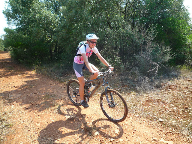 A la moitié du parcours, nous montons au col du Bougnon. C'est raide, il faut s'accrocher, mais nous y voilà. Nico me dit: "On continue juste un peu, comme ça on aura vue sur la mer pour pique-niquer". Dans ces cas-là, il faudrait savoir dire non. Mais on y va. Fatigue/passage technique/ guibole gauche maladroite, voilà que je n'arrive pas à défaire ma pédale automatique et c'est la chute à l'arrêt! Nico s'impatiente, je m'énerve. Poussage de vélo sur une montée raide, puis marches en rondins où il faut encore porter le vélo. Ras le bol. Le pique nique arrive enfin, bien mérité.